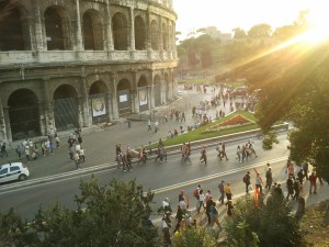 E intanto mi ero avvicinata alla fermata Metro. La colorata mandria della manifestazione CGIL sulla via del ritorno con lo sfondo del Colosseo, era uno spettacolo.