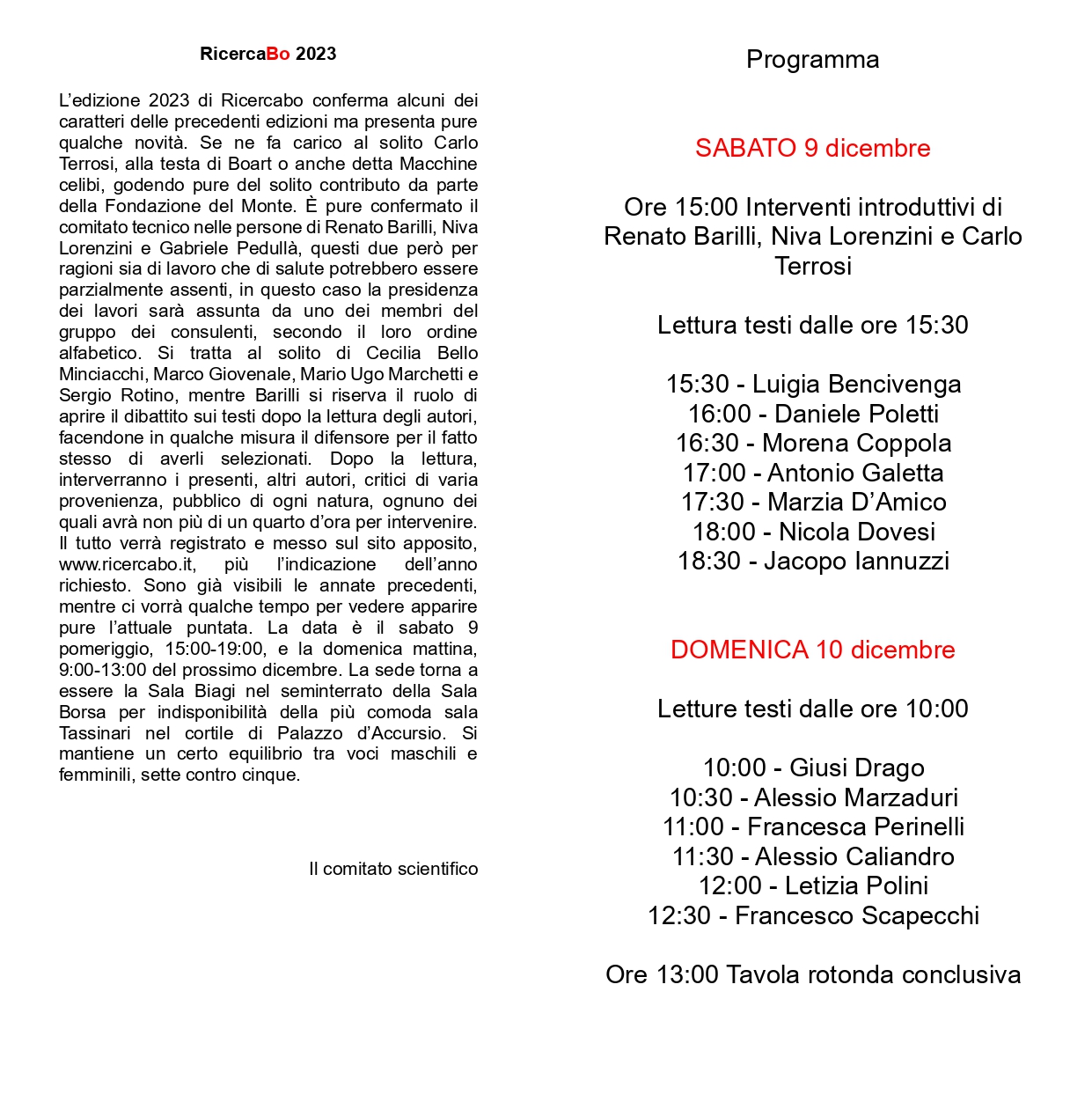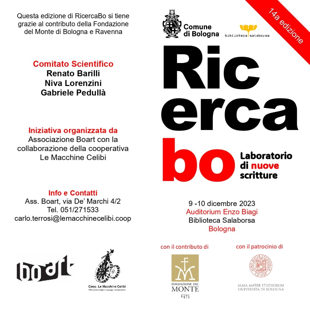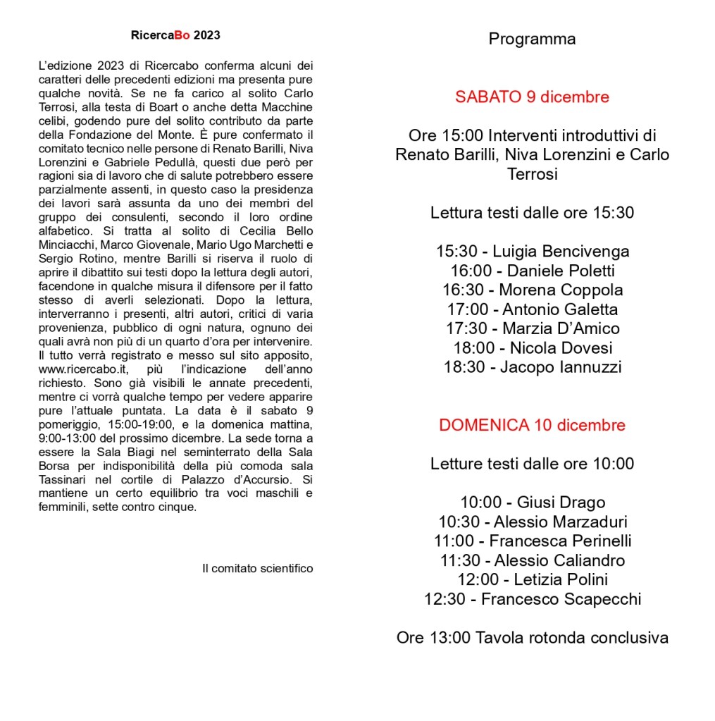 L’edizione 2023 di Ricercabo conferma alcuni dei caratteri delle precedenti edizioni ma presenta pure qualche novità. Se ne fa carico al solito Carlo Terrosi, alla testa di Boart o anche detta Macchine celibi, godendo pure del solito contributo da parte della Fondazione del Monte. È pure confermato il comitato tecnico nelle persone di Renato Barilli, Niva Lorenzini e Gabriele Pedullà, questi due però per ragioni sia di lavoro che di salute potrebbero essere parzialmente assenti, in questo caso la presidenza dei lavori sarà assunta da uno dei membri del gruppo dei consulenti, secondo il loro ordine alfabetico. Si tratta al solito di Cecilia Bello Minciacchi, Marco Giovenale, Mario Ugo Marchetti e Sergio Rotino, mentre Barilli si riserva il ruolo di aprire il dibattito sui testi dopo la lettura degli autori, facendone in qualche misura il difensore per il fatto stesso di averli selezionati. Dopo la lettura, interverranno i presenti, altri autori, critici di varia provenienza, pubblico di ogni natura, ognuno dei quali avrà non più di un quarto d’ora per intervenire. Il tutto verrà registrato e messo sul sito apposito, https://ricercabo.it, più l’indicazione dell’anno richiesto. Sono già visibili le annate precedenti, mentre ci vorrà qualche tempo per vedere apparire pure l’attuale puntata. La data è il sabato 9 pomeriggio, 15:00-19:00, e la domenica mattina, 9:00-13:00 del prossimo dicembre. La sede torna a essere la Sala Biagi nel seminterrato della Sala Borsa per indisponibilità della più comoda sala Tassinari nel cortile di Palazzo d’Accursio. Si mantiene un certo equilibrio tra voci maschili e femminili, sette contro cinque.