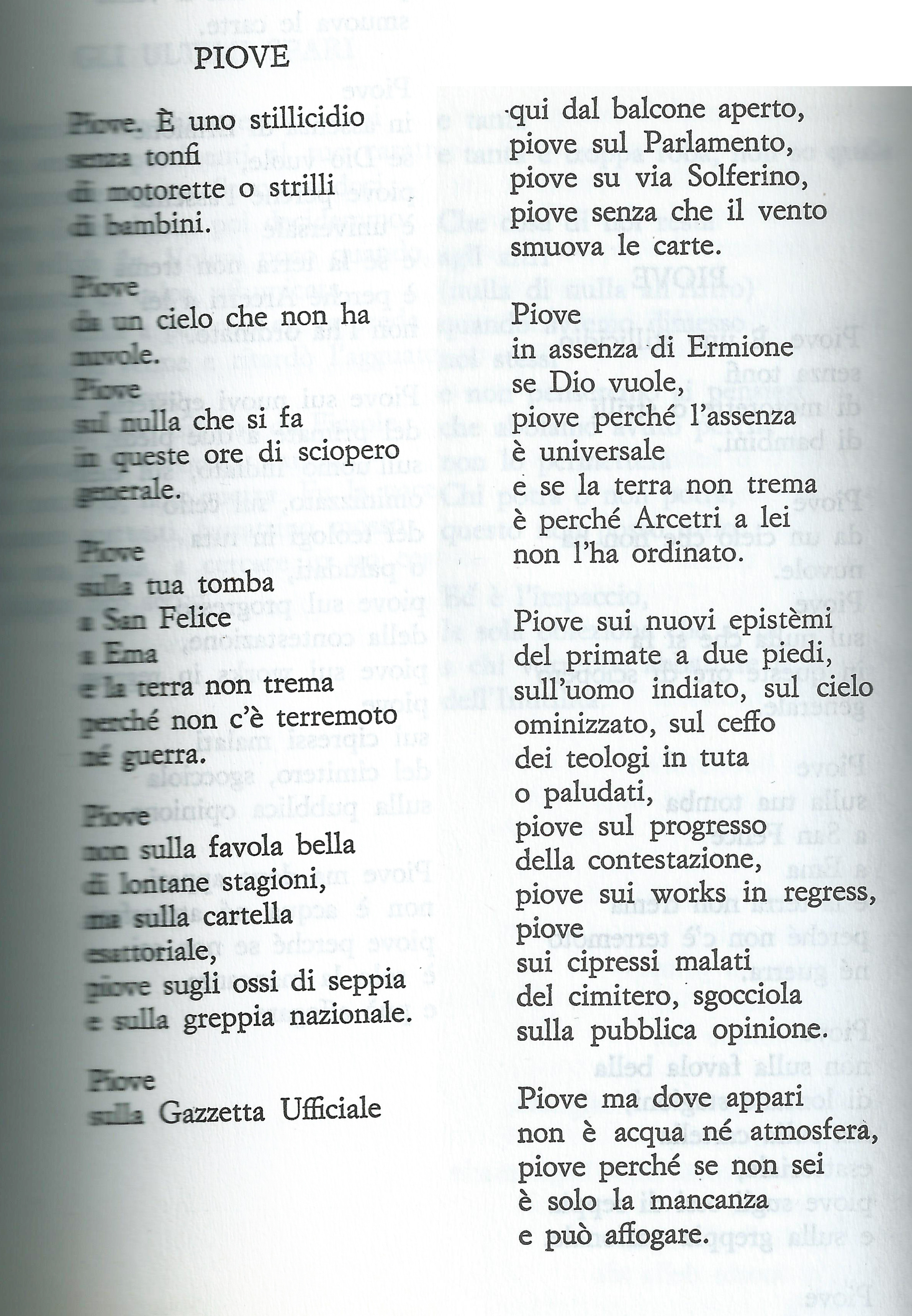 Eugenio mi ha fatto ricredere, ha ripreso il ritmo della pioggia del defunto Vate con un tono leggero, ironico, ma andando cento volte più a fondo. Forse da queste parti abbiamo davvero un talento per l’ironia. Forse, in minima parte, ce l’ho anch’io.