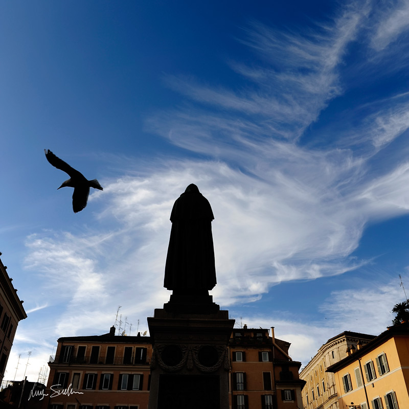 La scultura in bronzo che rappresenta l’eretico Giordano Bruno è stata collocata nella cinquecentesca piazza Campo de’ Fiori nel 1889, dopo un lungo patteggiamento tra il papato, che temeva (e teme) Bruno anche dopo morto, e un comitato costituito, tra gli altri, da Victor Hugo, Michail Bakunin, George Ibsen, Giovanni Bovio ed Herbert Spencer.