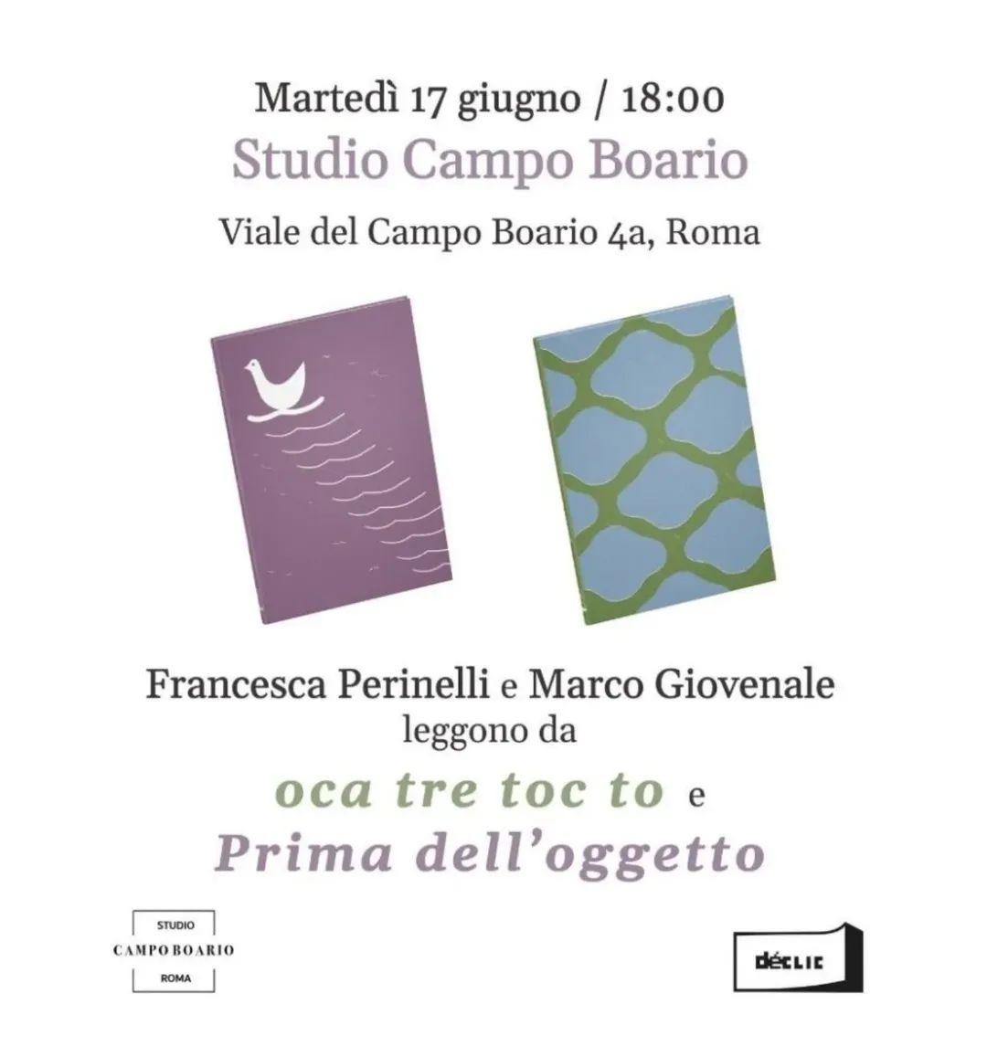 ragionabolo in tema delle reciproche produzioni déclic, tra il sommo Marco Giovenale e l’umile emula infima sua, cioè me, martedì 17 giugno in quel di Studio Campo Boario.