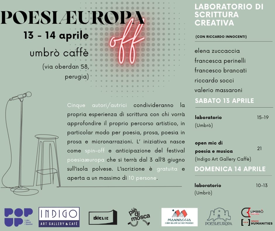 ◫ Sabato 𝟭𝟯 𝗮𝗽𝗿𝗶𝗹𝗲 dalle 15:00 alle 19:00 e domenica 𝟭𝟰 𝗮𝗽𝗿𝗶𝗹𝗲 dalle 10:00 alle 13:00 a 𝗣𝗲𝗿𝘂𝗴𝗶𝗮 presso i locali di 𝗨𝗺𝗯𝗿ò (via Oberdan 58) avrà luogo il laboratorio di scrittura 𝗣𝗼𝗲𝘀𝗶𝗮𝗲𝘂𝗿𝗼𝗽𝗮𝗢𝗳𝗳, nato dalla collaborazione di Spazio Humanities, POPUP • libri / spunti / spuntini, Mannaggia – Libri da un altro mondo e Indigo Art Gallery & Café.