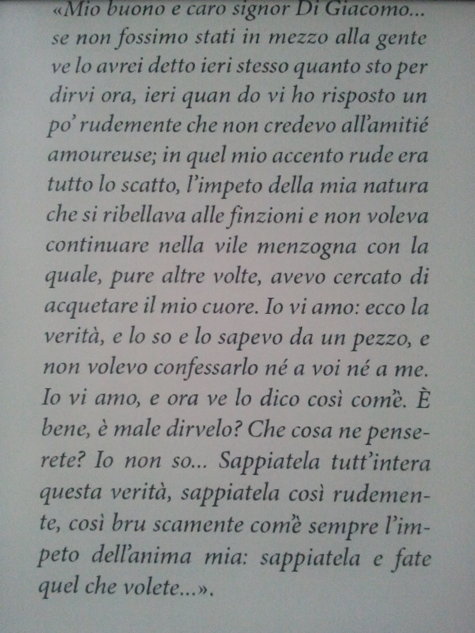 Ho cercato anch’io di reinterpretare un frammento, uno scambio epistolare di cui è andata perduta una metà importante. La Capria riporta che, grazie a un fortunato ritrovamento, ci è giunta tutta la ricchezza di colori dell’umana vicenda che vide coinvolti il poeta Salvatore Di Giacomo e la donna che, malgrado lui -il quale voleva soltanto una “amitié amoreuse”- gli stette accanto tutta la vita (ecco, forse davanti a un soggetto del genere io mi sarei fermata prima: la fanciulla alla fine impazzì).