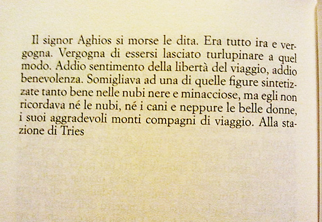 Aghios ambiva a farsi delle amicizie occasionali, lontane dal suo quotidiano, con le quali sfoggiare la propria bonomia e generosità. Si ostinava a difesa della libertà (della quale non conosceva nulla, me ne sono convinta in quel vagone dove ne discorse a lungo tra sé e sé. O forse mi sembrava, i rumori del treno parevano rivelare mozziconi di frasi che solo io potevo decifrare). Avevo una scarpetta che penzolava sulla punta del piede disteso, e Aghios la fissava ipnotizzato, senza trattenere alcun pensiero. Così appresi il senso della sua “libertà”, quella di non amare alcuno, se non “tutta la vita, gli uomini, le bestie e le piante, tutta roba anonima e perciò tanto amabile. Anzi, “- sempre parole sue – “se fra gli uomini non ci fossero state anche le belle donne avrebbe potuto aspettare la morte con la serenità di un santo.”